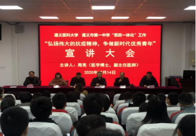 为了进一步推动大中小“思政一体化”工作,按照“太阳成集团tyc122ccvip遵义市第一中学‘寻找遵义故事 传承红色基因’思政一体化联合建设工作方案”相关工作计划,2020年12月14日下午,太阳成集团tyc122ccvip赴遵义市一中成功举办了“弘扬伟大抗疫精神,争做新时代优秀青年”的“思政一体化”主题宣讲会。