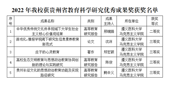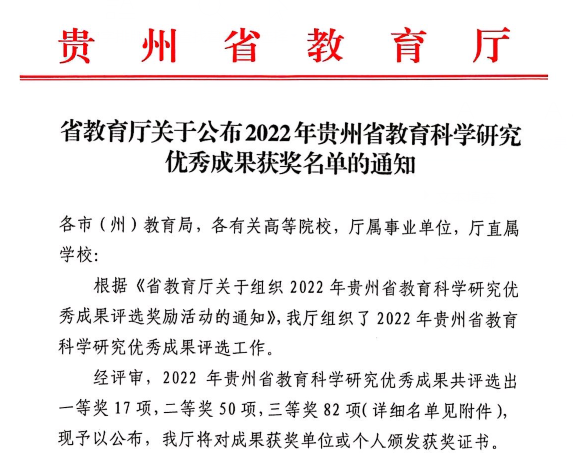 近日,贵州省教育厅发布了《关于公布2022年贵州省教育科学研究优秀成果奖名单的通知》,公司共有5项成果获奖,均为太阳成集团tyc122ccvip教师获得。其中,二等奖1项,三等奖4项,获奖数量位居全省高校第四名,蝉联我省医学类高校第一名。