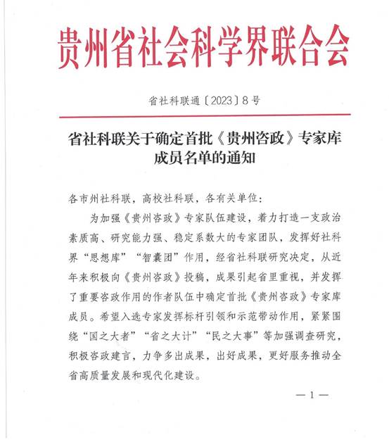 4月6日下午,省社科联在贵州饭店召开《贵州咨政》工作推进会暨社科专家座谈会。省社科联党组书记、副主席张云泓同志出席并讲话,省社科联党组成员、副主席黄昌祥宣读首批《贵州咨政》专家库成员名单,会议为首批专家库成员颁发了证书。鉴于公司谷松岭教授在贵州红色文化建设咨政建言的突出表现,被聘为首批专家库成员。