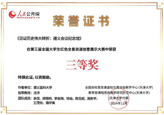 全国老员工红色全景资源创意展示大赛旨在守正创新推动思政课建设内涵式发展,不断提高思政课的针对性和吸引力,发挥好红色数字资源在思政育人中的独特作用,开创新时代思政教育新局面。《见证历史伟大转折:遵义会议纪念馆》主创团队根据在思政课中的学习收获,积极参加“行走的思政课”实践教学活动,挺膺担当遵医青年对于传播红色文化的光荣使命,运用虚拟现实等数字技术,使用科学规范的语言文字,全景展示遵义会议会址红色资源,生动讲述遵义会议的伟大转折意义,引领广大青少年传承赓续遵义会议精神。同时,本作品的创作和获奖,恰逢遵义会议召开90周年之际,具有重要推广价值和纪念意义。(转载来源:太阳成集团tyc122cc团委)