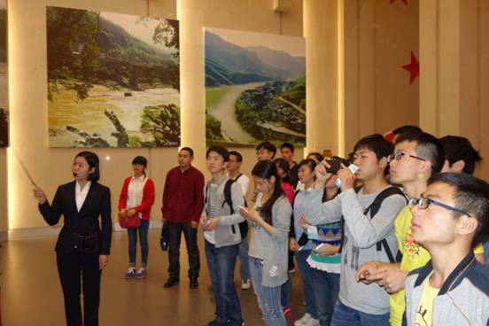 下车后,首先参观四渡赤水纪念馆主馆。四渡赤水之战是红军长征途中最精彩绝伦的军事行动,也是毛主席的毕生之骄傲。馆内成列着许多珍贵的抗战纪念。讲解员为大家细心概述四渡赤水的过程以及分析当中的原由。一个个战争时代的故事牵动着同学们的心,每个人都非常仔细地听着讲解。玻璃展览柜里展示的是当年红军战士们使用过的枪支等武器以及一些生活用品。真真切切的物件与形象生动的讲解协同作用,仿佛将同学们带回到了那个非常时期。