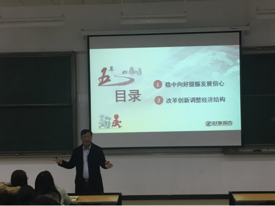 12月2日下午,公司党委副书记刘建国在新蒲校区第二阶梯教室为2017级新生讲授《形势与政策》课。在这堂主旨为“学习和贯彻十九大精神”的课上,刘建国用生动的语言和精辟的讲解,与百余名本科生一起分享了自己对十九大精神的理解和认识。