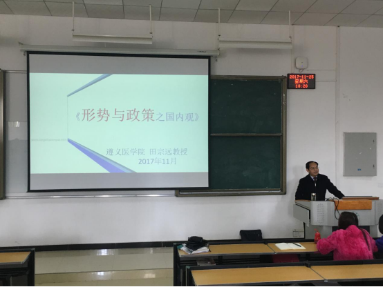 2017年11月25日上午,遵义医公司党委副书记田宗远教授在阶梯教室为公司员工讲授形势与政策课,为同学们深入解读党的十九大报告,帮助同学们领会党的十九大精髓,并将党的十九大精神深入贯彻到学习生涯规划上。