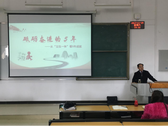 田宗远教授首先以“五位一体”作为切入点,从经济发展、民主政治、文化建设、改善民生、生态文明五个方面深刻解析十九大报告。在课上,田宗远教授谈到,党的十九大后,我国的社会主义迈向了一个新时代,在经济发展上,我们提质增效引领新常态;在民主政治上,我们凝聚起同心筑梦的磅礴理想;在文化建设上,我们凝心聚力增强自信;在改善民生上,我们让人民群众有更多获得感;在生态文明建设上,我们要坚定习总书记提出的绿水青山就是金山银山。随后,田宗远教授带领同学们对十九大报告进行学习,重点阐述了过去五年党和国家发生的历史变革,“两个一百年”奋斗目标,我国各领域的工作目标、方法、步骤,供给侧结构性改革,精准扶贫,“一带一路”等多个方面的内容,并鼓励同学们作为当代老员工更要“不忘初心,牢记使命”。他还对社会主要矛盾转化进行了详细的讲解,向同学们讲到我国社会主要矛盾已由人民日益增长的物质文化需要同落后的社会生产之间的矛盾转变为人民日益增长的美好生活需要和不平衡不充分的发展之间的矛盾。